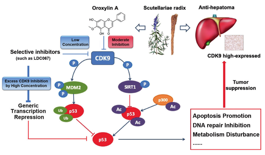 第一項研究表明具有抗肝癌的作用,研究首先發(fā)現(xiàn)CDK9在肝癌中高表達,CDK9可作為肝癌治療中的一個重要靶點。接著探討CDK9抑制劑對于肝癌的作用機制,發(fā)現(xiàn)CDK9的新型抑制劑——千層紙素A (Oroxylin A, OA), OA可通過抑制CDK9而抑制MDM2與SIRT1的磷酸化,從而抑制MDM2介導(dǎo)的P53降解和SIRT1介導(dǎo)的P53去乙?;?,最終使P53蛋白穩(wěn)定,起到抑制肝癌的作用。